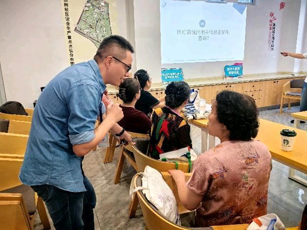 在互动问答环节,现场居民踊跃参与,纷纷就日常生活中遇到的健康器械相关问题提问,例如“健康手环是否属于医疗器械?”“保健器材与医疗器械如何区分?”“所有医疗器械都有有效期吗?”以及“如何查询医疗器械的官方备案信息?”等。杨老师及现场专家团队对这些问题给予了耐心细致的解答,有效消除了居民的诸多疑惑,增强了公众对医疗器械产品的科学认知与辨别能力。